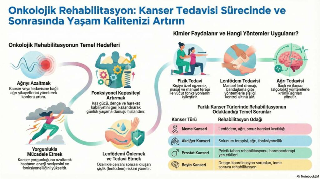 Onkolojik Rehabilitasyon, kanserin kendisinden veya tedavi sürecinden kaynaklanan sorunlar ile mücadelede hastaların fonksiyonelliğini ve yaşam kalitesini artırmayı, günlük yaşama uyumlarını kolaylaştırmayı kapsar.
